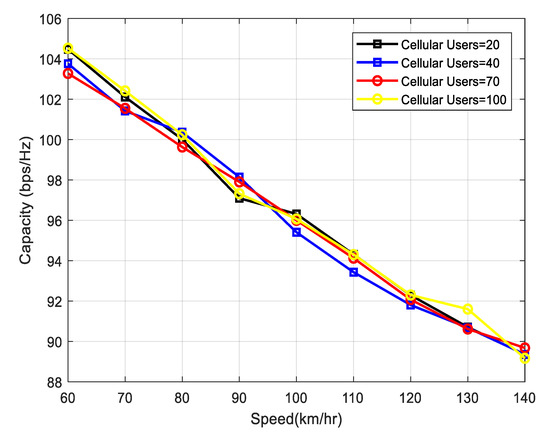 4.2. Vehicular Speed vs. Capacity at different Number of Users
