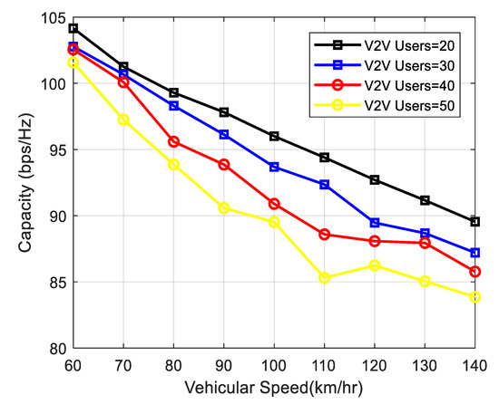 The impact of increasing V2V users would significantly affect the V2I capacity due to the fact that the vehicles involved in V2V communication are on the same highway, and therefore high interference results from a lower SINR of V2I links, thus lowering capacity. Figure 8 shows the varying number of V2V users along with capacity at various vehicular speeds.