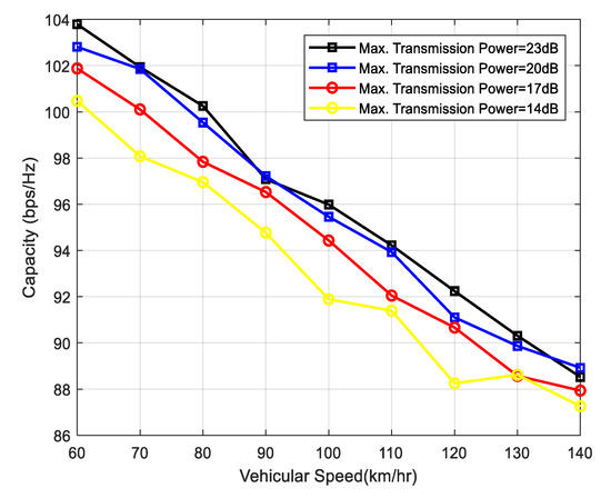 Vehicular speed vs. capacity at different transmission powers.