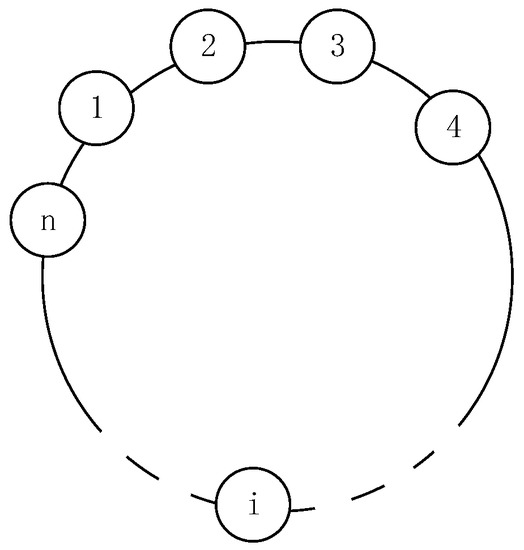 In a ring network (as in Figure 2), nodes are homogeneously symmetrical. An application of the ring network topology is in distributed independent decision making. In that case, a number of decision makers have to rate on a certain issue. The final rating of the issue is the average of the ratings from all the decision makers. To equalise the weight of the ratings from each decision maker, the decision makers should be in the same condition when assessing the issue. When interconnection is required and a centralized information collector is excluded, a good choice is that the decision makers communicate in a ring topology in that: (1) every decision maker is in the same topological condition; (2) least communication links are needed, thus the possibility that the ratings interact each other is minimized. To ensure that the ratings are based on independent assessments by the decision makers, it is required that each decision maker does not know the others’ ratings; thus, a distributed privacy preserving average consensus scheme is needed. According to Theorem 4, we derive as follows: