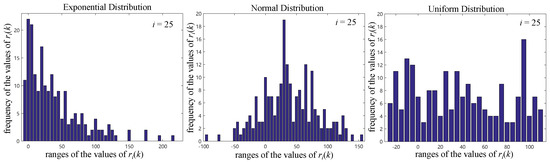 First, we run the scheme under different distributions of . These distributions are exponential distributions, normal distributions and uniform distributions that for each node i, the variance of remains unchange regardless of the change of the distributions to exclude the influence of the variances. For the exponential distribution of the random sequence in each node i, to ensure that the random sequence satisfies (7), the parameter of the exponential distribution is set to be , namely ; thus, the mean of the exponential distribution is and the variance is . For the normal distribution of the random sequence in each node i, to ensure that the random sequence satisfies (7) and the variance remains the same as that of the exponential distribution correspondingly, the mean of the normal distribution is set to be and the variance is set to be , namely . For the uniform distribution of the random sequence in each node i, to ensure that the random sequence satisfies (7) and the variance remains the same as that of the previous two distributions correspondingly, the lower bound of the uniform distribution is set to be and the upper bound of the uniform distribution is set to be , namely ; thus the mean of the uniform distribution is and the variance is . Note that, in order to eliminate the residuals, each distribution is modified by We select node 25 to show how the random sequence is distributed under those three different distributions in Figure 14.