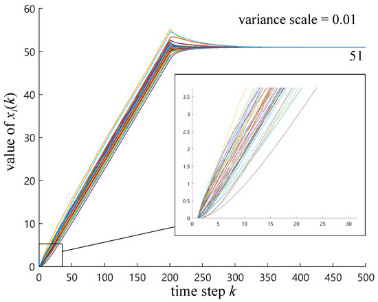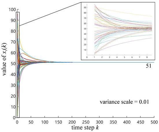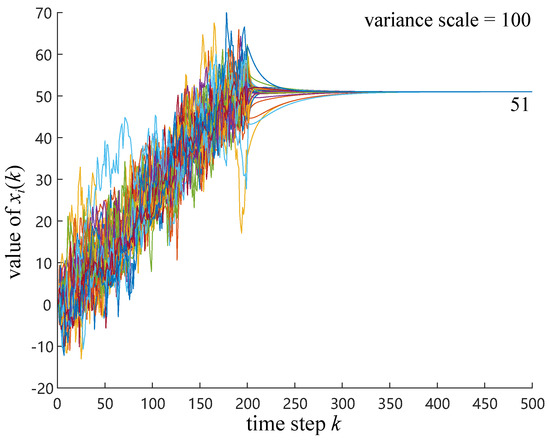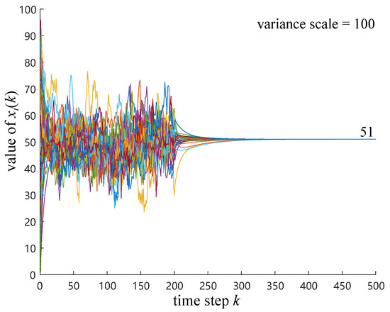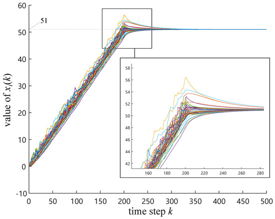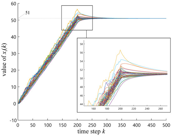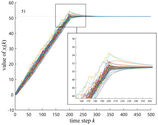 Under these three different distributions of , we run the scheme proposed in Section 2.3, the results are shown in Figure 15, Figure 16 and Figure 17. It can be seen that, all the nodes’ states converge to the real average of the initial condition , which is 51, under different distributions of . This also verifies Theorem 2 that the scheme ensures exact average consensus.