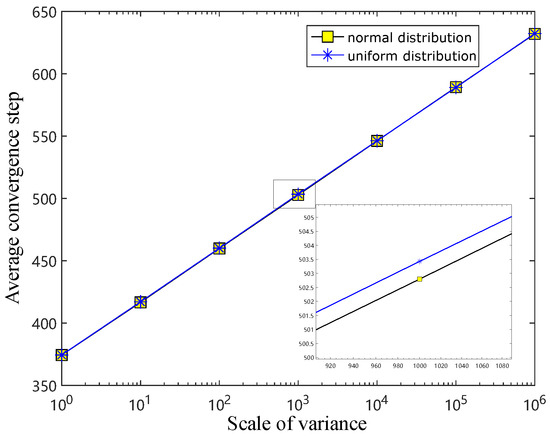 It can be seen from Figure 18 that when the scales of the variances are the same, the convergence steps are the same regardless of the distribution of . Besides, both the convergence steps of normal distribution and uniform distribution increases linearly with the increasing of the logarithm of the scale of the variances.