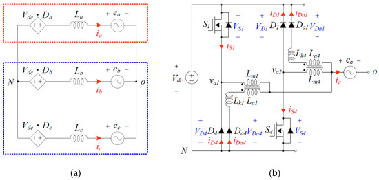 Switching-cycle average model and circuit diagram of the proposed inverter with reference directions of currents and voltages for A-phase: (a) switching-cycle average model; (b) circuit diagram for A-phase.