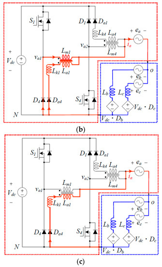 In Stage I, the switch S1 is turned on and the diodes D4 and Da4 are turned off. When S1 is turned on, the energy of the magnetizing inductor Lm1 is linearly charged by the dc-link voltage Vdc. Since diodes D4 and Da4 are reverse-biased, L1 operates like a simple inductor even though it is a coupled inductor. The phase current ia flows through Vdc, S1, Lm1, and ea. In this Stage I, the auxiliary winding of the coupled inductor L1 does not work.