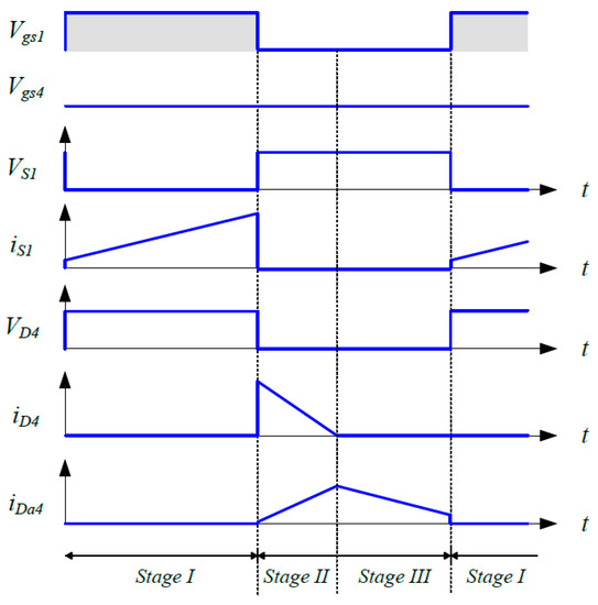 In Stage II, the switch S1 is turned off and the diodes D4 and Da4 are turned on. Because S1 is turned off, the energy stored in the magnetizing inductor Lm1 is released to the output side through the main diode D4 and auxiliary diode Da4. In this Stage II, both main and auxiliary windings of the coupled inductor L1 work. When S1 is turned off, the main diode D4 is immediately turned on by the inductor current freewheeling. By the auxiliary winding of the coupled inductor L1, the voltage across the auxiliary winding is produced in an ideal turns ratio relationship. Then, auxiliary diode Da4 is turned on. The phase current ia flows through Lm1, ea, and D4. Simultaneously, ia flows through La1, ea, Da4, and Lk1. Because the auxiliary winding of the coupled inductor L1 has a slightly larger number of turns than does the main winding, a positive voltage is applied to the leakage inductor Lk1. The current of the main diode D4 keeps decreasing to zero current and the current through Lk1 increases linearly. The current-shifting process from the main diode D4 to the auxiliary diode Da4 begins.