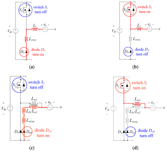 In a practical design, the SiC schottky diodes suffer from significant current overshoots and voltage oscillations due to the resonance of RLC circuit formed by the diode parasitic resistance, stray inductance, and diode capacitance. Figure 6 shows the switching characteristic of the SiC schottky diode for one switching-leg. Lstray is the parasitic stray inductance. Figure 6a,b show the switching characteristic of the conventional inverter when the diode D4 is turned on and turned off, respectively. Figure 6c,d show the switching characteristic of the proposed inverter when the diode Da4 is turned on and turned off, respectively. The steady-state operation of the proposed inverter is changed from Stage III to Stage I. In the conventional inverter, when the switch has started operating again as shown Figure 6b, the parasitic capacitances of the switch and the parasitic RLC circuit of the diode D4 including Lstray resonate within the switching leg. Thus, the switch peak current and diode reverse-recovery peak current are quite high. These high currents cause switching-power losses, which reduce the power efficiency. On the other hand, in the proposed inverter, before the switch is turns on, the current through the original diode is already zero and the switch current flows through the magnetizing inductor. Thus, the reverse-recovery peak current and reverse-recovery time of the main diode are reduced. The current rising rate of the switch will be lowered, which can reduce the turn-on switching-power loss of the switch. Also, the current through the auxiliary diode at the end of Stage III can be limited by the leakage inductor of the auxiliary winding. Therefore, the reverse-recovery peak current and reverse-recovery time of the auxiliary diode are also reduced.