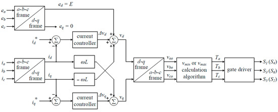 where vmin = min (vao, vbo, vco) and vmax = max (vao, vbo, vco). Figure 7 shows the control block diagram of the proposed inverter. The conduction times Ta, Tb, and Tc of switches S1, S3, and S5 for three-phase PWM pulses are generated by the space-vector modulation technique without a computational burden such as square root and arctangent.