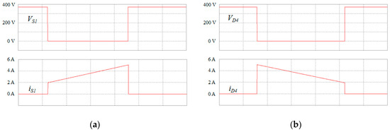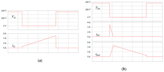 Figure 8 shows the simulation results of the conventional inverter in Figure 1 when Vdc is 370 V, ea, eb, and ec are 127 Vrms. Figure 8a shows VS1 and iS1. Figure 8b shows VD4 and iD4. As shown in Figure 8a,b, VS1 and VD4 are clamped to Vdc, and the slope of iS1 and iD4 is opposite.