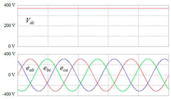 Figure 9 and Figure 10 show the simulation results of the proposed inverter when Vdc is 370 V, ea, eb, and ec are 127 Vrms. Figure 9a shows VS1 and iS1. Figure 9b shows VD4, iD4, and iDa4. As shown in Figure 9a,b, the VS1 and VD4 are clamped to Vdc and the current through the original diode can be steered to an auxiliary diode and can be reduced to zero before the switch turns on. Figure 10 shows eab, ebc, eca, and Vdc. Balanced line-to-line voltages are equal in magnitude and frequency and out of phase with each other by 120°.