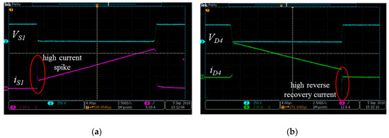 Figure 11 shows the experimental waveforms of the conventional inverter in Figure 1 when Vdc is 370 V, and ea, eb, and ec are 127 Vrms. Figure 11a shows VS1 and iS1. Figure 11b shows VD4 and iD4. The switch peak current and diode reverse-recovery peak current are quite high. As shown in Figure 11a,b, switching-power losses related to switch current and diode reverse-recovery current are increased, reducing the power efficiency of the inverter.