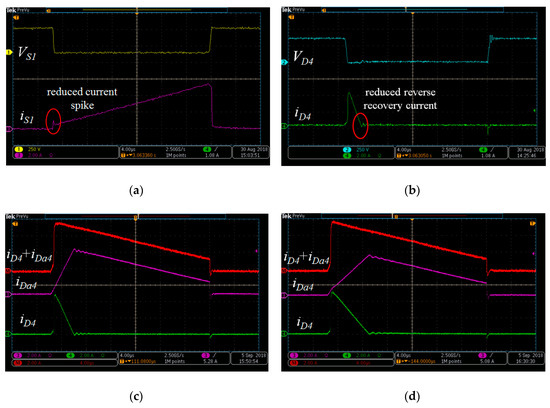 Experimental waveforms of the proposed inverter: (a) VS1 and iS1; (b) VD4 and iD4; (c) iD4 + iDa4, iDa4 and iD4 with Lk = 5 µH; (d) iD4 + iDa4, iDa4 and iD4 with Lk = 15 µH.