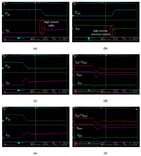Figure 13 shows the experimental waveforms of the conventional inverter in Figure 1 and the proposed inverter in Figure 2 when Vdc is 370 V, and ea, eb, and ec are 127 Vrms. Figure 13a shows VS1 and iS1 in the conventional inverter of the enlarged Figure 11a. Figuere 13b shows VD4 and iD4 in the conventional inverter of the enlarged Figure 11b. We observed in Figure 13a,b that there is a high switch current spike and the diode reverse-recovery current is increased, as shown in Figure 11a,b, which reduces the power efficiency of the inverter. Especially, Figure 13b shows significant output oscillations of the SiC schottky diode, which result from the ringing formed between the diode parasitic capacitance, parasitic stray inductance, and diode resistance. Figure 13c shows VS1 and iS1 with Lk = 5 µH in the proposed inverter of the enlarged Figure 12a. Figure 13d shows iD4 + iDa4, iD4 and iDa4 with Lk = 5 µH in the proposed inverter of the enlarged Figure 12c. Figure 13e shows VS1 and iS1 with Lk = 15 µH in the proposed inverter. Figure 13f shows iD4 + iDa4, iD4 and iDa4 with Lk = 15 µH in the proposed inverter of the enlarged Figure 12d. We observed from Figure 13c to 13f that the switch peak current and diode reverse-recovery peak current are reduced, as is the reverse-recovery time, as shown in Figure 12a,b. Also, the current oscillation has been much alleviated because the current through the original diode can be steered to an auxiliary diode by using magnetically coupled inductors.