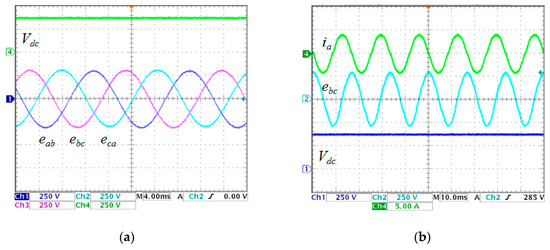 Figure 14 shows the experimental waveforms of the proposed inverter when Vdc is 370 V, ea, eb, and ec are 127 Vrms. Figure 14a shows eab, ebc, eca, and Vdc. Balanced line-to-line voltages are equal in magnitude and frequency and out of phase with each other by 120°. Figure 14b shows ia, ebc, and Vdc for a 1.0 kW output power.