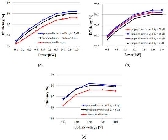 Figure 15 shows the measured power efficiencies for the conventional inverter in Figure 1, the proposed inverter with Lk = 5 µH, and the proposed inverter with Lk = 15 µH, respectively. Figure 15a shows the power efficiencies of the inverters for different output power levels when Vdc is 370 V, and ea, eb, and ec are 127 Vrms. The conventional inverter has the power efficiency of 97.6% at the rated power. On the other hand, the proposed inverter with Lk = 5 µH has improved power efficiency, achieving a power efficiency of 98.0% at the rated power. The proposed inverter improves the power efficiency by 0.4% compared to the conventional inverter by using magnetically coupled inductor switching technique. The proposed inverter with Lk = 15 µH has achieved a power efficiency of 98.2% for a 1.0 kW output power. Figure 15b shows the power efficiencies of the proposed inverter for different leakage inductances when Vdc is 370 V, and ea, eb, and ec are 127 Vrms. The leakage inductances of the proposed inverter have major impact on the results. As shown in Figure 15b, the proposed inverter with Lk = 15 µH has achieved the highest efficiency compared to the extra leakage inductance. Both the proposed inverter with Lk = 10 µH and Lk = 20 µH have achieved a power efficiency of 98.1% at the rated power. If the leakage inductance is lower than 5 µH, the proposed inverter does not operate normally. On the other hand, if the leakage inductance is higher than 15 µH, the conduction loss of the coupled inductor increases, decreasing the power efficiency. The minimum value of the leakage inductance that the proposed inverter can operate normally is 5 µH, and the maximum value of the leakage inductance that the proposed inverter can achieve high efficiency is 15 µH. Figure 15c shows the power efficiencies of the inverters for different dc-link voltage levels at the rated power. As shown in Figure 15c, the maximum power efficiency of the inverters is dc-link voltage of 370 V at the rated power. If the dc-link voltage is lower than 370 V, the modulation index is very high. High modulation index causes switching-power loss, decreasing the power efficiency. On the other hand, if the dc-link voltage is higher than 370 V, the voltage stress of switching devices is very high. The use of high-rating switching devices causes the high cost as well as low efficiency.