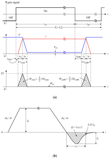 In order to analysis the power loss for a switching device, switching characteristics are presented, as shown in Figure 16. Figure 16a shows the switching waveforms and instantaneous switching-power loss. During the turn-on transition of the switching device, the current build-up consists of a short delay time td(on) followed by the current rise time tri. The voltage falls to a small on-state value of Von with a voltage fall time of tfv. Then, the energy dissipated in the device during this turn-on transition can be approximated as