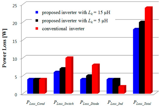 Figure 17 compares the loss breakdown plots of the inverters for a 1.0 kW output power. The proposed inverter with Lk = 15 µH achieves the power efficiency of 98.2% at 1.0 kW, resulting in power losses of 18 W. The proposed inverter with Lk = 5 µH achieves the power efficiency of 98.0%, resulting in power losses of 20 W. On the other hand, the conventional inverter achieves the power efficiency of 97.6%, resulting in power losses of 24 W. PLoss_Cond is the conduction losses of switching devices including SiC MOSFETs and SiC schottky diodes. PLoss_Switch is the switching losses of the SiC MOSFETs. PLoss_Diode is the reverse-recovery loss of the SiC schottky diodes. PLoss_Ind is the core losses of the coupled inductors. PLoss_Total is the total power losses. The core losses of the proposed inverter because of the coupled inductors are high compared with those of the conventional inverter. However, the switching losses and the reverse-recovery losses of the proposed inverter are reduced remarkably.