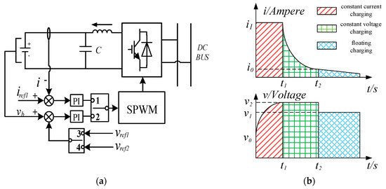 Battery charging management scheme: (a) Block diagram of energy storage battery control strategy during charging. (b) Energy storage battery charging stage diagram.