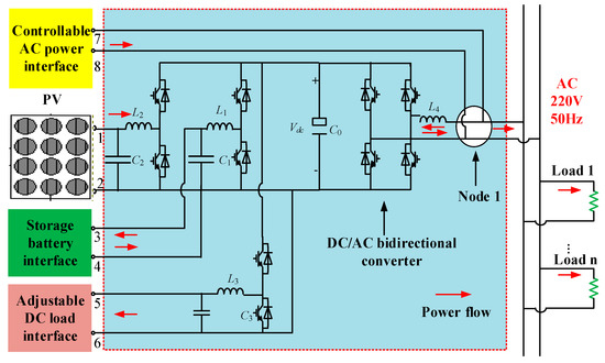 An electric energy router (EER) based on power electronic conversion technology emerged [4]. The EER is a kind of power equipment that combines information technology and power electronic conversion technology to realize the efficient use and transmission of distributed energy [5]. According to the power grade of the EER and its position in the distribution network [6], the EER was divided into three categories, namely, mainline EER, regional EER, and home EER. This paper focused on the research on the home EER. The EER using a high-frequency isolating transformer [7,8,9,10] can reduce the volume of the equipment and improve the efficiency of the equipment, but the high-frequency isolating transformer had a complex control and increased the cost [11]. It was not conducive to use in small-capacity systems, especially home EERs. Some studies [12,13] adopted a H-bridge cascade structure, while other studies [14,15] adopted a modular structure. They were also suitable for high-voltage and high-power occasions but not for single-phase EERs. One study [16] provided three typical structures of EER and established corresponding evaluation indexes but did not involve the specific topology. Another study [17] presented a home EER structure of an AC-DC hybrid micro-network architecture but only conducted simulation research under simple working conditions. In [18], a home energy router and energy management strategy for AC/DC hybrid sources and consumers was proposed. By using the distributed hierarchical energy management system (HEMS), energy routing could be achieved to obtain different functions, such as peak load shifting, electricity plan following, etc. However, the HEMS mentioned in the article is cumbersome and impractical. For example, it requires that “users use the human-machine interaction interface such as App. in smartphones to arrange the power consumption time and target”. This is obviously not practical, since users’ electricity use behavior is often random and uncertain. This requirement is a heavy burden on users. Another study [19] proposed a HEMS based on an energy router. By controlling the switch array, the optimal matching of the power supply and the load is realized, so that the renewable energy is used to the maximum extent. However, this method requires that household appliances are classified according to the degree of sensitivity to the power quality, divided into sensitive and non-sensitive loads, and even the same type of household appliance is different for different people, which complicates the previous planning. At the same time, this solution requires a switch array, which greatly increases the cost. Based on the functional requirements of EER, a preliminary analysis of its structural construction was provided [20,21], but it was only a theoretical analysis, and no specific control scheme and result verification was provided.