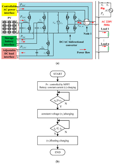 As shown in Figure 1, there are two main types of DC side DC/DC converters: unidirectional and bidirectional converters. The unidirectional DC/DC converter is used as the photovoltaic power generation network interface, and the maximum power point tracking (MPPT) control strategy is generally used to achieve the maximum use of renewable energy. However, when the light is sufficient, so that the photovoltaic power generation is greater than the overall demand of the system, constant voltage control is required for the stable operation of the system [27].
