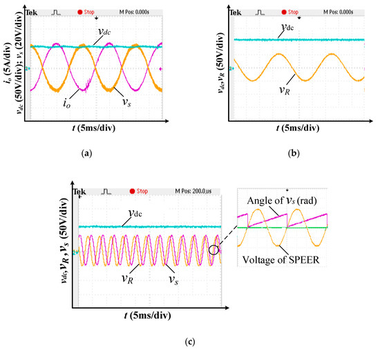 Figure 18 shows the experimental waveforms of the SPEER. Among them, Figure 18a shows the grid-connected startup. The DC/AC bi-directional converter controls the DC bus voltage of 80 V and realizes the unit power factor control. Figure 18b shows the isolated network startup of SPEER. The battery controls the DC bus voltage to 80 V, and the DC/AC bi-directional converter operates in the inverter state. When the grid returns to normal, the system issues a grid-connected command, and the SPEER first performs grid-connected pre-synchronization. The experimental waveforms of the pre-synchronization process are shown in Figure 18c.