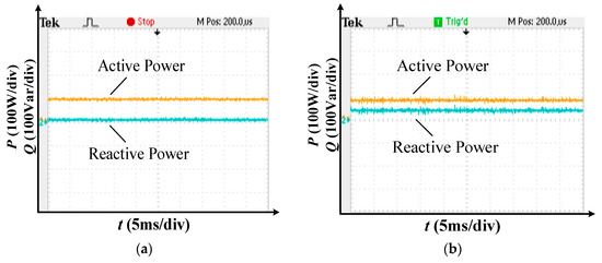 Experimental waveforms of the given power control strategy for SPEER: (a) the active power is 100 W; the reactive power is 0 Var; (b) the active power is 80 W; the reactive power is 50 Var.