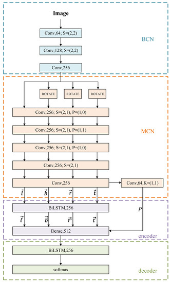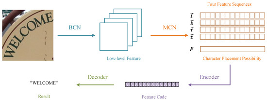 As shown in Figure 2, first, we use a basic convolutional neural network (BCN) to extract the low-level features. Then, we obtain the four direction feature sequences and the character placement possibility through a multidirectional convolutional neural network (MCN). The four direction feature sequences work in four directions: horizontal vectors (left → right) and (right → left), vertical vectors (top → bottom) and (bottom → top). Horizontal and vertical features are extracted by sampling the height and width of the feature map down to 1. Then, characters in the natural images can be represented as a sequence named feature code through the encoder, which combines the four direction feature sequences and corresponding placement possibility. Finally, the decoder predicts the result of the text from the feature code. In this paper, our method is not only effective at recognizing regular text, but also succeeds at predicting irregular text in complex natural images.