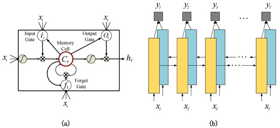 (a) The structure of LSTM unit: a memory cell and three gates, namely the input gate, the forget gate, and the output gate. (b) The structure of BiLSTM used in our method. It combines two LSTMs, one for past context (left to right) and one for future context (right to left).