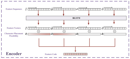 Encoder is the process of combining four direction feature sequences into one. By using BiLSTM, we can encode the output feature sequences of MCN into the four direction feature vectors . By this means, the four direction feature vectors contain the contextual information, which also represents the four directions’ features. Each character in a natural image can be described by ; therefore, we use MCN to calculate the possibility of corresponding characters in each direction, which is termed the character placement possibility . For each text image, the character placement possibility is used as the weight of each feature vector, and with a size of equal to . As shown in Figure 6, we use the corresponding to combine the four direction feature vectors as follows: