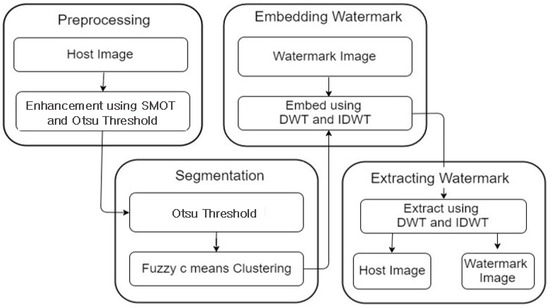 Biomedical images contain an enormous amount of information. When a watermark is embedded into the image, the information can be distorted. That is why pre-processing and segmentation processing are implemented. The proposed model is illustrated in Figure 1. The detailed description of the model is presented in Subsection 3.1 to Subsection 3.3.