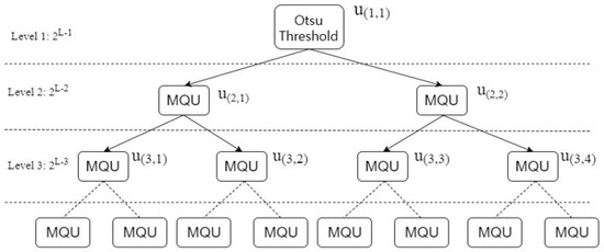 For image enhancement, we used the successive mean quantization transform (SMQT) algorithm with the help of Otsu’s threshold. This algorithm converts the image into a binary tree where each node represents the mean quantization unit (MQU). Each of the MQUs works in three steps: mean calculation, quantization, and input set split [15]. In this case, Otsu’s threshold value is utilized at the root of the binary tree of the SMQT algorithm. The output tree is shown in Figure 2. The tree is expressed as u(l,n), where l is the current level and n is the output number. The final SMQT result is calculated by adding the weighting result of the data points of u(l,n). The algorithm aims to have a low dynamic image range. That is why the weighting is calculated by 2L-1 up to L = 8.