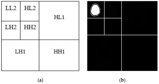 (a) Structure of second level DWT, (b) Second level DWT of the image.