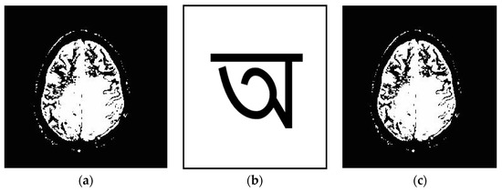 For evaluating the robustness and imperceptibility of the proposed model, we set up an experiment using a personal computer (PC) with the following configurations: AMD FX(tm)-8300 Eight-Core Processor, ~3.3 GHz, 16384 MB RAM. As a simulation tool, we utilize MATLAB software version R2016a. To evaluate the proposed model, we used the Computer Vision Group, University of Granada (CVG UGR) Image dataset, where all of the images are 256 × 256 in size. As a watermark image, we used an image of size 512 × 512, which is presented in Figure 7b. To keep the uniform size of the input image and watermark image, we converted both images to 2048 × 2048. The watermark image was embedded into the MR host image. Figure 7 shows a sample of the host image, watermark, and watermarked image.