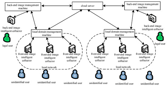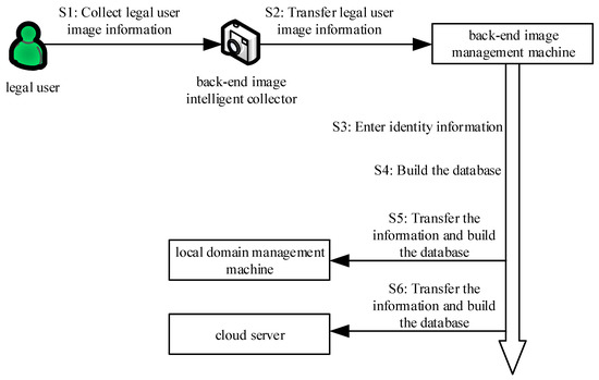 At this phase, the back-end image intelligent collector intelligently collects the image of the legal user and transmits it to the back-end image management machine. Then, the back-end image management machine requests the back-end manager to input the identity information and uses a secure encryption algorithm to transmit it to the local domain management machine and the cloud server through the secure channel. Finally, they establish their own image information database in the back-end image management machine, local domain management machine, and cloud server to complete the system establishment. The brief process diagram is shown in Figure 2. The algorithm is shown in Algorithm 1.