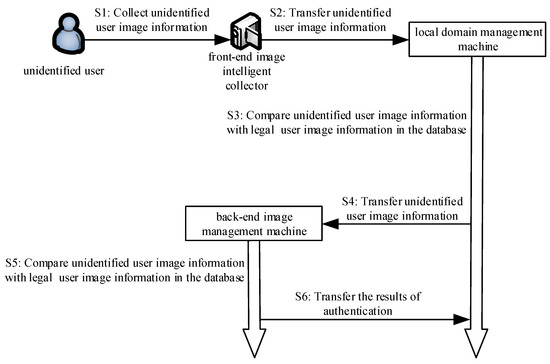 At this phase, the front-end image intelligent collector collects the unidentified user image information and transmits it to the local domain management machine via the secret network. The local domain management machine applies for authentication to the back-end image management machine in the form of a digital signature. Then, the local domain management machine encrypts the unidentified user image information and transmits it to the back-end image management machine through the encryption algorithm. Next, query the image information of all legal users in the local domain management image information database and the back-end image management image information database and respectively compare the legal user image information in these two databases with the image information of the unidentified user. Finally, complete mutual authentication between the local domain management machine and the back-end image management machine. The brief process diagram is shown in Figure 3. The algorithm is shown in Algorithm 2.