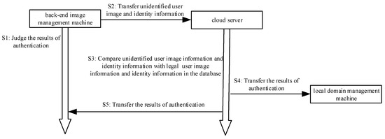 In this phase, the back-end image management machine applies for authentication to the cloud server in the form of a digital signature. Secondly, the back-end image management machine encrypts the information such as the unidentified user image information and transmits it to the cloud server through the encryption algorithm. Then, query the image information of all legal users in the cloud server image information database. Next, compare the image information and the identity information with the image of the unidentified user, which has been authenticated by the signature and the identity information of the unidentified user. Finally, complete mutual authentication between the back-end image management machine and the cloud server. The brief process diagram is shown in Figure 5. The algorithm is shown in Algorithm 4.