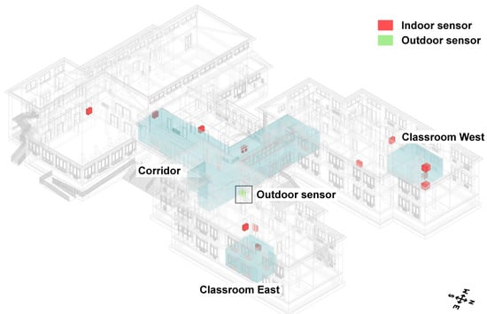 To provide a thorough analysis, we decided to focus our study on the building as a whole, as well as three representative rooms, chosen based on symmetrical shapes and regular internal distribution: (i) a classroom facing west, (ii) a classroom facing east and (iii) the corridor at the main entrance. Both classrooms are comparable in terms of size, internal characteristics, use and occupants and differ only in the orientation. Hence, they reasonably represent two opposed thermal conditions of the same type of classroom. The corridor is not characterized by a constant occupancy during working hours. Nonetheless, it is considered significant for this study because it is a very large environment located in a central position of the building, with many openings and glazed windows.