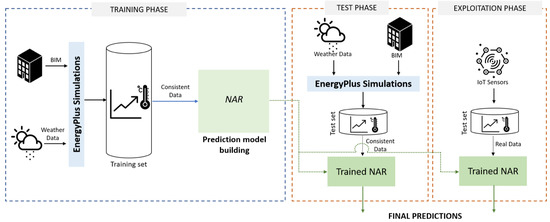 In this work, we designed a Nonlinear Autoregressive neural network and we optimized the model on four different environments chosen as case study, i.e., the three relevant rooms and the whole building (see Section 3). In Figure 2, we show the main steps of our proposed solution. During the training phase, time series data consisting in realistic artificial indoor-air temperature trends (see Section 3) are given as input to build a prediction model based on NAR. In the test phase, new unseen data from the realistic artificial test set are fed into the trained models to obtain the temperature predictions. Finally, in the exploitation phase, new unseen data sampled by IoT devices (deployed in the real-world building) are given as input to the trained models to evaluate the final predictions against real indoor air-temperature values. The rationale of splitting the experimental assessment into two different phases (test and exploitation) is the following. In the test phase, the model is tested on a large synthetic dataset obtained with EnergyPlus simulations, as for the training. Hence, the aim of this test is assessing the prediction capabilities of the model in a significant number of examples. In the exploitation phase, the NAR is assessed on a much smaller real-world dataset, which is less representative in terms of size but on the other hand provides better insights into the generalization capabilities of the model in real-life conditions. On top of that, it provides an indirect assessment of the reliability of the synthetic data that were used for training the model.