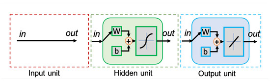 At the time t, the ANN is fed with the n regressors of the signal y. These inputs are transferred through multiple layers of neurons. Each neuron is a computational unit characterized by (i) a set of weights W (one per each input connection j), (ii) a bias b and (iii) an activation function h. Hence, a neuron i computes its output following the Equation (2):