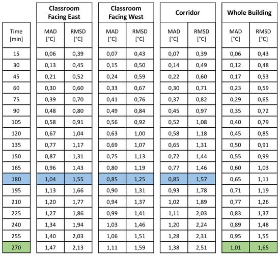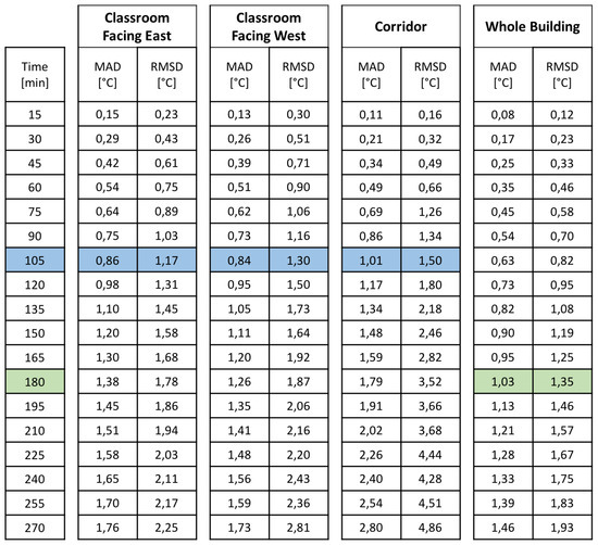 According to most standards and literature studies, to guarantee no impact on the thermal comfort perceived by the occupants, the operative temperatures should never fluctuate more than C (F) within 15 min, nor change more than C (F) within 1 h [55,56]. Upon these considerations, in our study we established a value of MAD of about C as the maximum acceptable threshold for our temperature predictions. Based on this conservative threshold, we assessed the maximum prediction horizons that can be guaranteed by our models. As it can be seen in Figure 5, this prediction horizon is 180 min when considering the individual rooms (see blue-coloured line) and 270 min for the whole building (see green-coloured line), which is quite a remarkable time-window. Compared to our previous work [7], we were able to improve MAD and RMSD performance index on average by and , respectively.