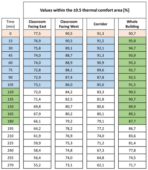 The obtained results are reported in Figure 7, separately for the three individual rooms and the whole building models. The first row of the table in Figure (at time 0, red coloured) shows the thermal comfort values obtained on the observed data, which can be used as a reference. The following rows of the table in Figure report the thermal comfort values obtained on the predicted data at increasing prediction horizons. The rationale of the experiment is: the closer the thermal comfort values to the corresponding reference values at time 0, the better the prediction. The blue and green areas in the Figure correspond to the prediction windows that were identified as reliable in our previous prediction performance analysis on the same data (respectively up to 105 min for the individual rooms and 180 min for the whole building).