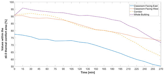 If we look at the blue and green areas, we can observe that the values are generally high, with a difference with respect to the reference values that is always below 6% for the individual rooms and below 3% for the whole building. As for the prediction performance metrics, the percentage of predicted values within the thermal comfort zone tends to decrease with the prediction horizon, even though with some minor oscillations. Figure 8 clearly shows this trend.