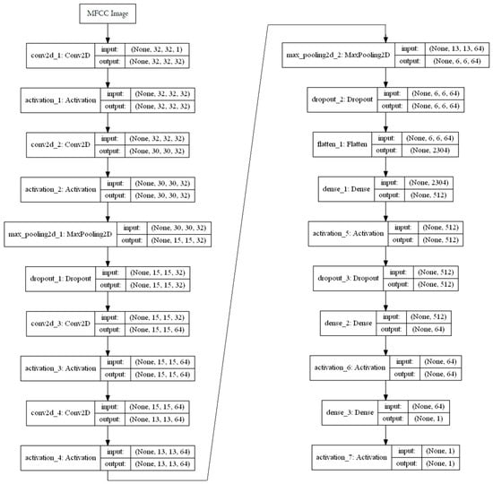 The first step to classify sound is to extract the features. In this paper, the Mel frequency cepstral coefficients (MFCCs) [,,] are calculated for each sample. The motivating idea of MFCC is to compress information into a small number of coefficients based on an understanding of the human ear. To calculate MFCC, the time-domain audio signal is first divided into 20–40 ms frames. Then, for each frame, the power spectrum is calculated. Then triangular-shaped Mel filterbanks are calculated and applied to the power spectra, and spectrogram is obtained. Human ears are much better at discriminating small changes in pitch at low frequencies (below 1 kHz) than they are at high frequencies. So, in Mel filterbank, the first 10 filters are placed linearly around 100, 200, … 1000 Hz. Above 1 kHz, these bands are placed with logarithmic Mel-scale. Then the logarithm of all filterbank energies and then their discrete cosine transform (DCT) are calculated to decorrelate the filter bank coefficients.