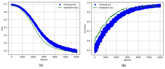 The model was trained and validated simultaneously for 6000 epochs with a learning rate of 1 × 10−5. The training and validation time was approximately seven minutes and 33 s. The plots of loss w.r.t. epochs and accuracy w.r.t. epochs are shown in Figure 8a,b namely for both training and validation dataset. From Figure 8, we see that both training and validation loss decrease, and that accuracy increases with more epochs. After 6000 epochs, the training loss is 0.10 and the validation loss is 0.08. Both the training and validation dataset gets an accuracy of approximately 0.96 after 6000 epochs.