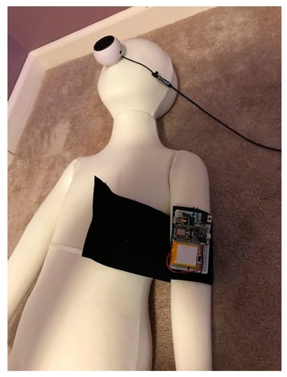 The wearable gadget was put on the upper left arm of a mannequin as shown in Figure 12. The gadget was approximately 30° tilted towards the floor so that the tilt sensor terminals are disconnected when the mannequin is sleeping on the back. A speaker was attached at the place of the nose of the mannequin and it was connected with a laptop to generate snoring and non-snoring sounds. The experimental setup is shown in Figure 13. The listener module was attached near the front wall of the mannequin. The smartphone app was used to start the sleep session. Snoring sounds were played using the laptop through the speaker placed at the nose. The listener module successfully detected the snoring and sent snoring status to the wearable gadget using BLE. The wearable gadget vibrated as long as the snoring sound was playing and stopped vibrating when the snoring sound was stopped. The vibration also stopped when the sleeping position was changed to the side as shown in Figure 13b. Non-snoring sounds such as silence, street sound, thunderstorm, door opening were played, and the listener module classified them as non-snoring sounds.