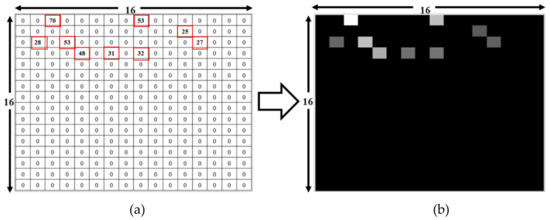 Deep learning input file conversion from 256 received signal strength indicator (RSSI) values to a 16 × 16 image. (a) Input comma-separated values (CSV) readings of the nine visible RSSIs from a total of 256 access points (APs). (b) Converted grayscale image with nine bright spots representing APs visible at the reference point (RP) [11].