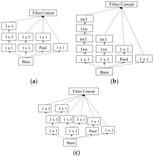 Another method to obtain higher classification accuracy is to widen the networks. Introduced in 2016, Inception v3 [44] is the combination of many ideas developed by several researchers. As shown in Figure 10, three modules are used to construct Inception v3. For inception module A in Figure 10a, two 3 × 3 convolutions replace a 5 × 5 convolution in the original inception module. For inception module B in Figure 10b, an n × 1 convolution followed by a 1 × n convolution replaces a 3 × 3 convolution (n = 3 in this paper). Inception module C increases the model width by dividing a 3 × 3 convolution into two 1 × 3 and 3 × 1 convolutions, shown in Figure 10c. With these inception modules, the number of parameters is reduced for the whole network to prevent overfitting. In Figure 11, a grid size reduction block is used to replace max pooling to increase network efficiency. Auxiliary classifiers were already suggested in a previous model of inception (i.e., Inception v1). There are some modifications in Inception-v3 (i.e., only one auxiliary classifier is used on the top of the last 17 × 17 layer, instead of using two auxiliary classifiers). Even though Inception v3 is deeper and wider than VGGNets, the computational cost and memory consumption of Inception v3 are much smaller than those of VGGNets. Figure 12 visualizes the activation of the 25th, 35th, 59th and 83rd convolutional network layers for Inception v3 in a 2D grid.