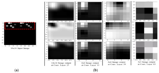 For our CNN model, a six-layer network was designed to predict 74 classes. The input image was generated from RSSI values received during the experiment with 74 RPs. At each RP, the RSSI value was recorded for 256 APs, though only a small subset of these APs was visible at each RP. These RSSI values from different APs created a 16 × 16 image. As shown in the example in Figure 1, there are nine visible APs out of 256 with RSSI values between 25 and 70, with the other APs having a value of 0. The RSSIs from different APs are converted into a grayscale image. The image brightness differs depending on the recorded RSSI values, with higher RSSI values being brighter. As shown in Figure 1a, the highest RSSI value is 70, which produces the brightest spot in the grayscale image shown in Figure 1b; the lowest value is 25, which is represented by the darkest nonblack spot. RSSI values of 0 produce no brightness, thus the remaining 247 spots are black. Similarly, the input RSSI files for the other 73 RPs produced different images for input into the DL network.