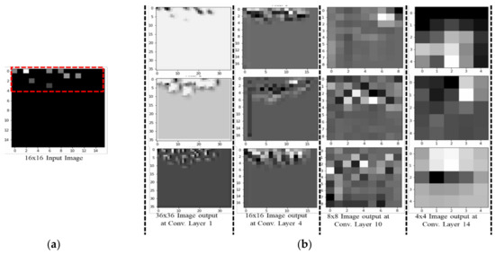 Figure 2 presents the architecture of our proposed method. Our CNN network comprises six layers, the first having input 16 × 16 × 1 grayscale images with rectified linear unit (ReLU) and dropout. Given the input dataset’s small size, the first layer does not use max pooling. The second layer consists of a 16 × 16 convolution with ReLU and an 8 × 8 max pooling layer with 18,496 parameters, and it produces output for the third 8 × 8 convolution layer (with ReLU and an 8 × 8 max pooling layer). This output is fed to the fourth layer, which is an 8 × 8 convolution layer with ReLU and an 8 × 8 max pooling layer. This output is fed directly to an FC layer with 2176 nodes, which leads to the next hidden FC layer, with 1088 nodes. Finally, the output is calculated using a softmax layer with 74 nodes, which is the total number of RPs in our setup. The inner width is 128, and the first three layers have no dropout, while the fourth layer uses a dropout of 0.5. The learning rate of our CNN model is 0.001, and the total number of parameters is 233,418. Table 2 summarizes all of the parameter settings. Figure 2 visualizes the activation of each convolutional network layer of our CNN model in a 2-dimensional (2D) grid. To generate the 2D image, the model is trained with RSSI dataset, and then the highest accuracy is used to visualize several kinds of features that a convolutional network learns at each layer of the network. Figure 3a represents an input image to pass through the network to visualize the network activation, and Figure 3b shows images of output that activates the neurons of the convolutional layers. The final image is generated at the softmax layer. It is important to note, here we are not using a deconvolutional layer; therefore, only features that a convolutional network learns at the following layers of the network is shown in the pictures.