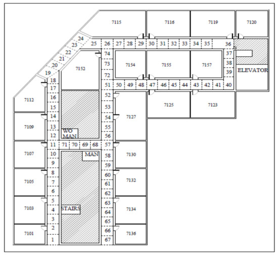 RSSI fingerprint data collection and the final experiment were both performed on the 7th floor of the new engineering building at Dongguk University, Seoul, South Korea, shown in Figure 15.